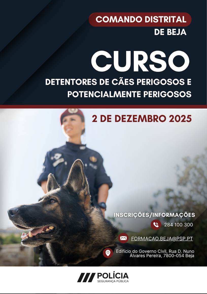 A PSP de Beja vai promover, no dia 2 de dezembro de 2025, o Curso de Detentores de Cães Perigosos e Potencialmente Perigosos, "dirigido a todos os cidadãos que possuam ou pretendam possuir animais destas categorias, conforme a legislação em vigor", informam em comunicado enviado às redações.