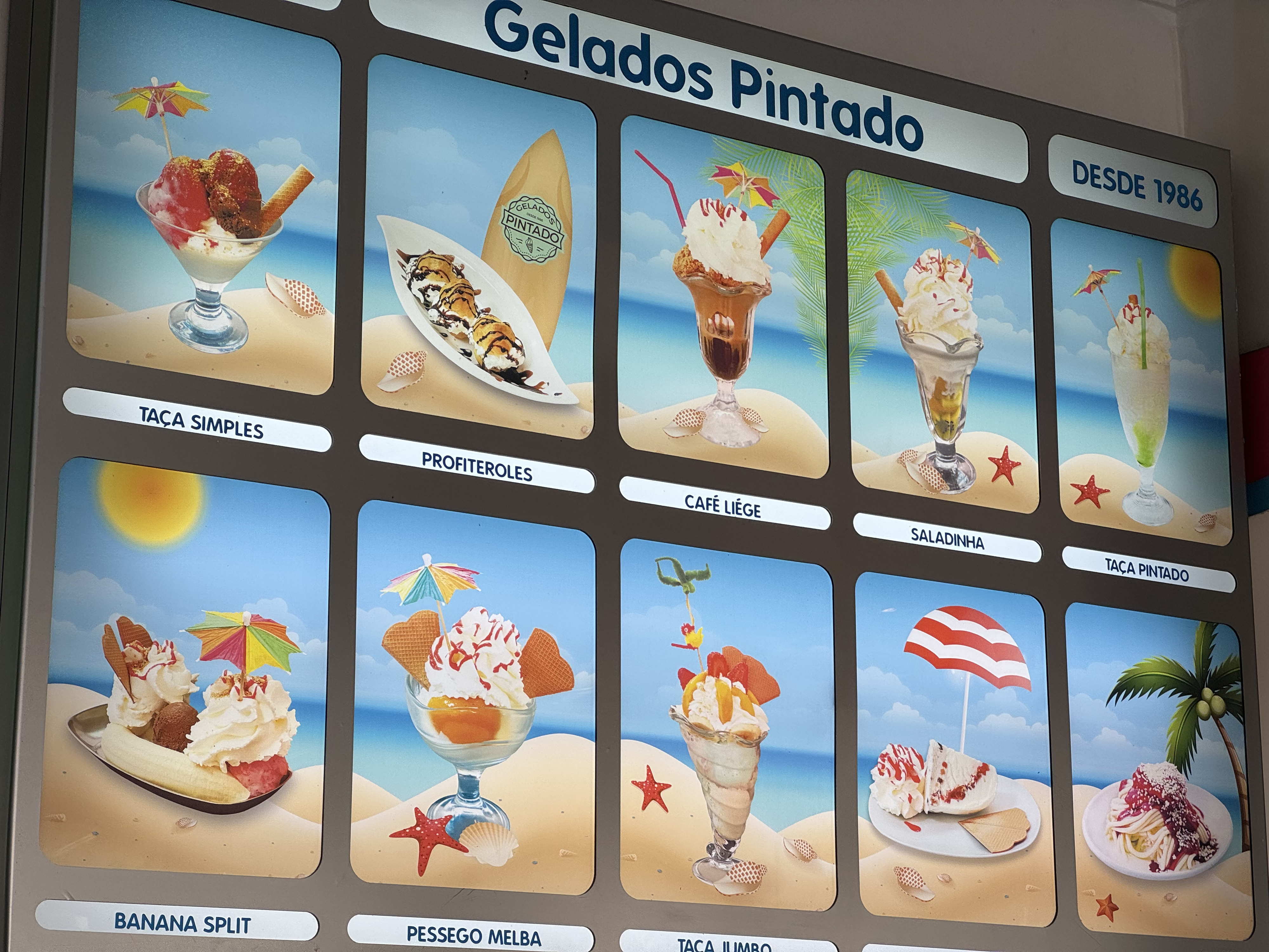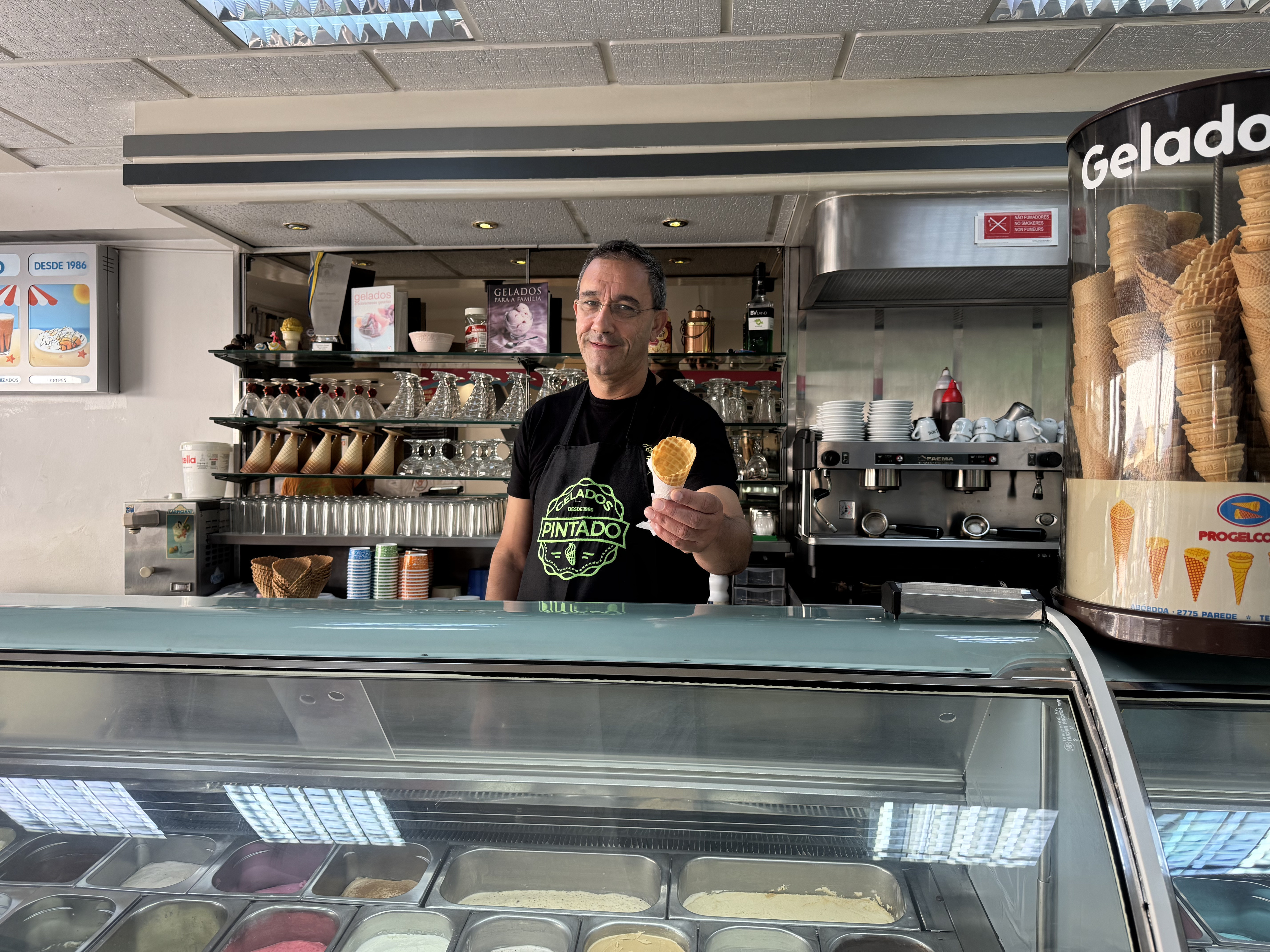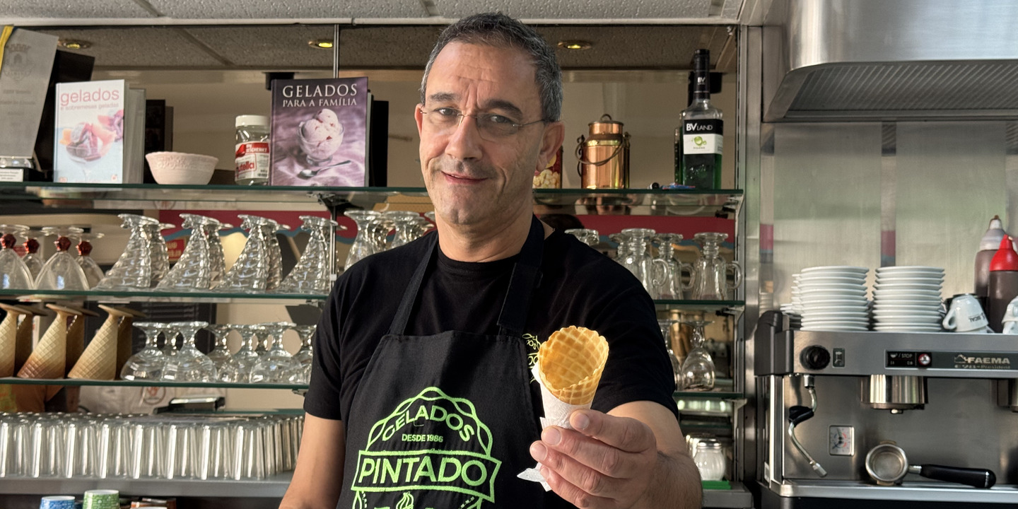 São 10h00 e as portas da icónica Geladaria Pintado, situada na movimentada Rua dos Pescadores, na Costa da Caparica, já estão abertas. Lá dentro, ainda se prepara tudo para o dia soalheiro que se avizinha. Monta-se a esplanada, repõem-se as cubas dos gelados no expositor e organiza-se tudo o resto, desde os copos aos cones.